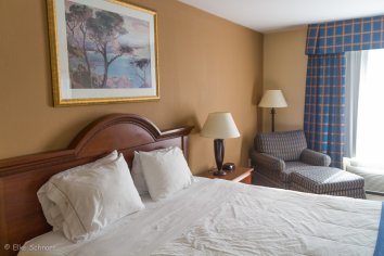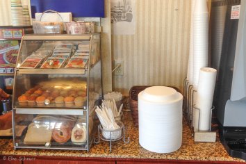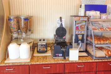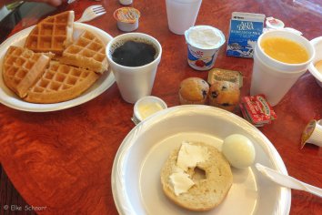 Zum Frühstück mussten wir in’s Nachbarmotel gehen. Es war recht durchschnittlich: Waffeln, Bagels, Muffins Obst, Joghurt und steinharte Eier. Das Ganze mit Wegwerfgeschirr aus Styropor bzw. Plastik.