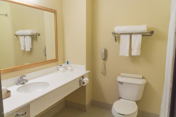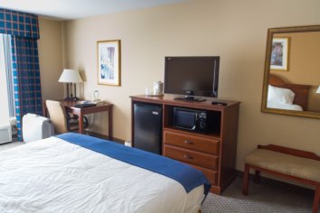Unser Zimmer mit Kingbett war sehr geräumig und sauber. Es war mit Fernseher, Kühlschrank (mit Gefrierfach), Mikrowelle, Safe und Kaffeemaschine ausgestattet. Auch das Bad war ausreichend groß.
