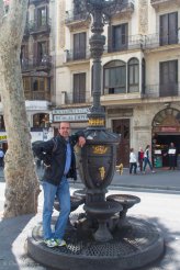 Zuerst kommen wir vorbei am Font de Canaletes: einer eisernen Wasserstelle aus dem 19. Jahrhundert. Dies ist ein traditioneller mittäglicher Treffpunkt der Fans des FC Barca und der Legende nach kommt jeder, der aus diesem Brunnen trinkt, irgendwann wieder zurück nach Barcelona. Und da wir das durchaus vorhaben, trinken wir natürlich auch eine Schluck Wasser aus dem Brunnen