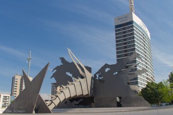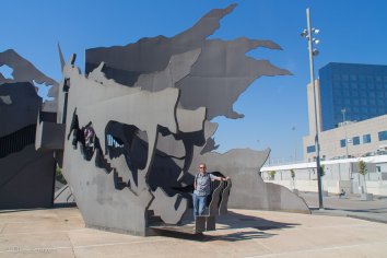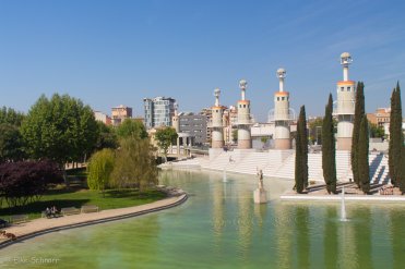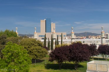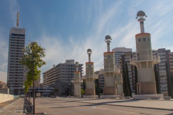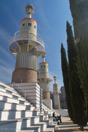 Wir steigen also in den nächsten freien Bus, bekommen auch einen Platz auf dem Oberdeck und fahren zunächst bis zur Station „Estacio de Sants“ wo wir uns den Parc de l´Espanya Industrial mit den interessanten Türmen anschauen: