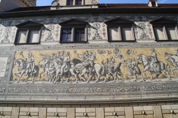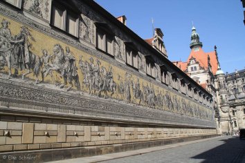Unser Weg führt uns außerdem am Fürstenzug vorbei. Dieses überlebensgroße Wandbild — bestehend aus ca. 25.000 Meißner Porzellanfliesen — ist ca. 100 Meter lang und zeigt die Ahnengalerie der zwischen 1123 und 1904 in Sachsen herrschenden Wettiner.