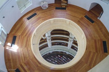 Da in der Kirche gerade ein Gottesdienst stattfindet, steigen wir zunächst in die offene Kuppel hinauf. Über einen Fahrstuhl und den Eselspfad (so wird der steinerne Weg nach oben genannt) sowie zwei weitere Treppenläufe gelangen wir zur 67 Meter hoch gelegenen Aussichtsplattform, wo wir einen wundervollen Rundblick über Dresden genießen.