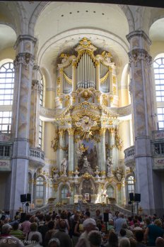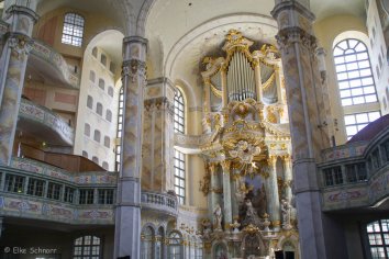 Mittlerweile ist es 13:00 Uhr und die Frauenkirche ist wieder für Besucher geöffnet. Wir betreten den Kirchenraum und sind total verblüfft: Sind wir sonst von Kirchen eher einen kühle, dunkle Atmosphäre gewohnt, präsentiert sich das Innere hier in freundlichen, hellen Pastellfarben und strahlt eine ganz eigene Schönheit aus. Mit den marmorierten Säulen und zahlreichen vergoldeten Details ist es eine wirklich gelungene Rekonstruktion der ursprünglichen barocken Gestaltung:
