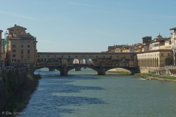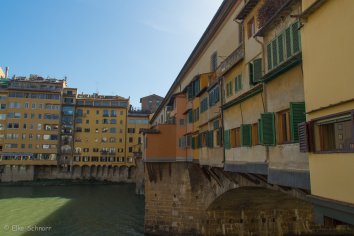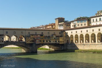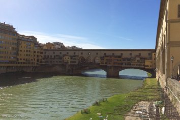 Nächster Halt auf unserem Stadtrundgang ist die Ponte Vecchio — eine mittelalterliche Brücke über den Fluss Arno. Sie ist eine der wenigen verbliebenen Brücken, die mit Häusern bebaut sind und sie ist die älteste Brücke in Florenz.