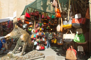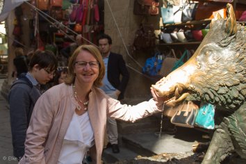Wir bummeln weiter durch die Straßen der Altstadt und kommen zum Mercato Nuovo — einem überdachten Markt, dessen beliebteste Attraktion die „Fontana del Porcellino“ ist, ein kleiner Brunnen mit einer Bronzestatue von einem Wildschwein aus dem 17. Jahrhundert. Die Legende besagt, dass jeder, der die — immer glänzende — Schnauze des Ebers berührt, wieder nach Florenz zurückkehren wird.