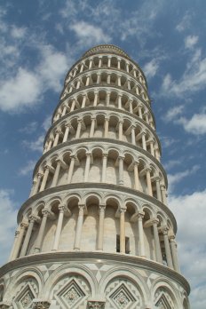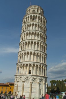 Die Schräglage des Turmes entstand aufgrund seines hohen Gewichts: schwerer Carrara-Marmor, fehlende Fenster und sieben schwere Glocken sorgen für immerhin 14.000 Tonnen, unter denen der lockere Lehm- und Sandboden langsam aber sicher nachgab.
