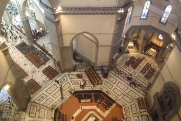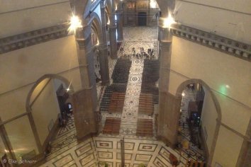 Auf dem Wiederabstieg gibt es dann die Möglichkeit, den Innenraum der Kuppel anzuschauen. Auf einer Art Galerie gehen wir am Fuß der Fresken in der Kuppel entlang und haben so einen wunderbaren Blick nach unten in die Kirche und auch aus nächster Nähe auf die großartigen Fresken.