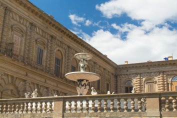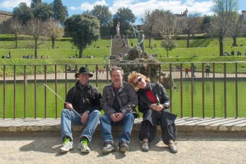 Unsere Wahl fällt auf den Boboli-Garten und wir tasten uns langsam vor in Richtung Arno. Nach einer kurzen Lunch-Pause unterwegs kommen wir dann zum Palazzo Pitti, hinter dem sich der Eingang zu den Gärten befindet. Hier haben es sich schon viele Touristen bequem gemacht und genießen auf den Stufen vor dem Palast einfach nur die Sonne — das Wetter ist aber auch wirklich einladend.