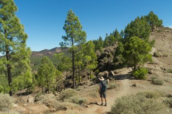 Wir kaufen an dem kleinen Stand auf dem Parkplatz noch ein paar Getränke und Müsli-Riegel und marschieren dann los. Der moderat ansteigende Weg führt an einem Berghang entlang — vorbei an Ginsterbüschen und Kiefernbäumen und bietet tolle Ausblicke auf das breite Tal von Ayacata und später auf das Zentrum und den Westen der Insel.