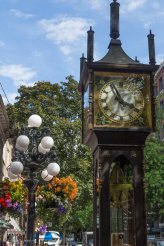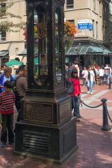 Und schließlich bummeln wir noch eine Weile durch Gastown, wo wir uns unter anderem die berühmte Steam Clock anschauen. Ihr mechanischer Pendelmechanismus wird durch einen Paternoster und das Gewicht von umlaufenden Kugeln angetrieben und wir haben Glück, gerade zur vollen Stunde dort zu sein, so dass wir das kurze Konzert der großen Dampfpfeife miterleben.