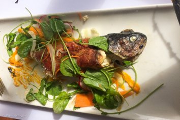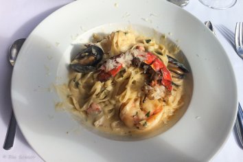 Auf dem Rückweg zum B&B gehen wir im Italien Kitchen zur Einstimmung auf den Urlaub noch lecker etwas essen — es gibt Seafood Tagliatelle für mich und Forelle für Andreas und beides ist richtig gut.
