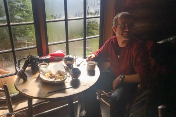 Ich bestelle mir eine heiße Schokolade und Andreas — man höre und staune — trinkt einen Tee. Das ist so eine Sensation, dass sie direkt fotografisch festgehalten werden muss