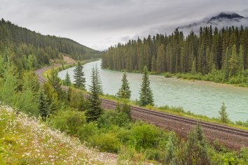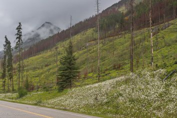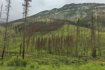 Über den Bow Valley Parkway geht es nun direkt nach Banff. Da es immer noch ununterbrochen regnet, legen wir keine größeren Stopps ein, halten nur einmal kurz bei den Überresten des 1993er Waldbrandes.