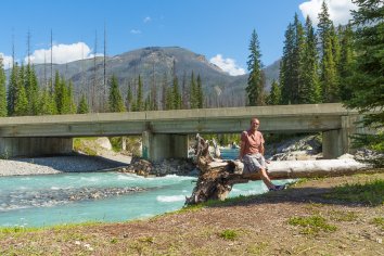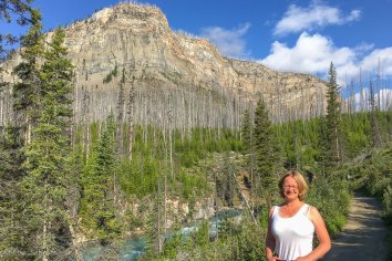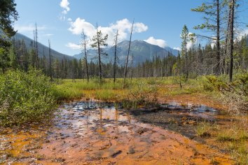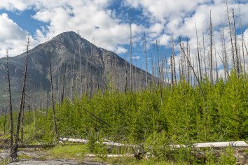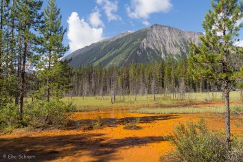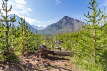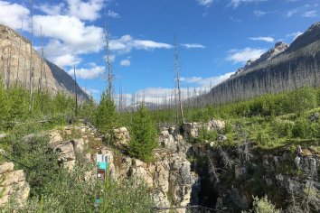 Außerdem kommen wir an vielen toten Bäumen vorbei, die dem verheerenden Waldbrand von 2003 zum Opfer gefallen sind. Dieser tobte 40 Tage lang und zerstörte 170 km² Wald — das sind 12 Prozent des Kootenay National Parks.