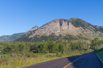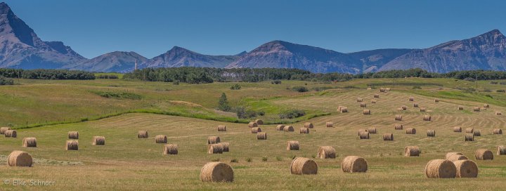 Gegen 14:00 Uhr haben wir unsere kleine Runde beendet und verlassen den Waterton Park wieder. Jetzt geht es auf dem Cowboy Trail nach Norden — unserer vorletzten Station entgegen. Wir kommen vorbei an endlosem Farmland, saftigen Wiesen, glücklichen Kühen, aufgestapelten Heuballen und im Hintergrund sind dabei immer die Berge zu sehen. Das ist einfach so toll, dass wir ein Dauergrinsen im Gesicht nicht unterdrücken können und auch gar nicht wollen.