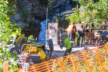 Kaum haben wir aber hier unsere Wanderschuhe angezogen und sind auf dem Weg zu den Falls, ist es mit der himmlischen Ruhe leider vorbei. Lautes Maschinendröhnen und Absperrbänder deuten daraufhin, dass hier Restaurierungsarbeiten im Gange sind.