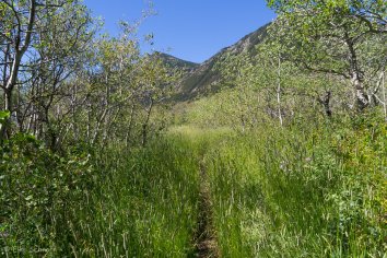 Dann stellen wir unser Auto am Parkplatz für den Horseshoe Basin Trail ab und marschieren auf diesem ein Stück los. Der gesamte Trail ist jetzt natürlich zu lang, aber wir wollen wenigstens noch zwei Stunden bissle was tun, bevor wir den Park wieder verlassen. Und immerhin ist das heute ja auch eine unserer letzten Chancen auf Wildlife — hier im Horseshoe Basin sollen Bären, Hirsche und Bighornschafe zu Hause sein.