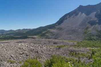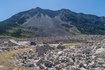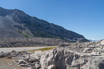 Als wir über den Crownsnest Pass kommen, fällt uns ein großes Feld aus riesigen Gesteinsbrocken auf der rechten Seite auf und wir halten neugierig an. Auf einer Infotafel lesen wir, dass wir hier die Überreste eines riesigen Bergrutsches — des sogenannten Frank Slide — vor uns haben und dass es nur wenige hundert Meter weiter eine Ausstellung dazu gibt.