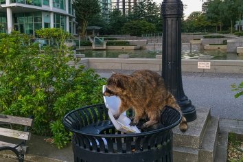 Dabei entdeckt er heute unterwegs einen kleinen Waschbären, der sich an einer Mülltonne zu schaffen macht und dort offenbar mehr oder weniger erfolgreich nach etwas zum frühstücken sucht.