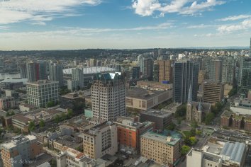 Als erstes wollen wir uns Vancouver einmal von oben anschauen und dafür bietet sich der Harbour Tower an, der mit seinen fast 170 Metern Höhe die Wolkenkratzer von Downtown noch überragt. Mit dem gläsernen Fahrstuhl fahren wir hoch zur Lookout-Plattform, von wo wir eine atemberaubende 360 Grad-Aussicht auf Downtown, den Stanley Park und Grouse Mountain haben.
