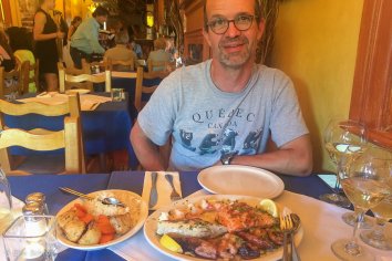 Wir nehmen die Fischplatte für zwei Personen mit Heilbutt, Lachs, Shrimps und Calamari und sind restlos begeistert.