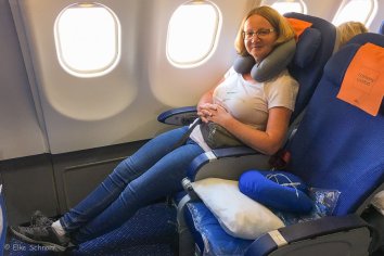 Die restliche Zeit bis zum Boarding geht schneller vorbei als erwartet und schon steigen wir in den Flieger ein. Und unsere Plätze sind in der Tat genial: Obwohl auf den Bordkarten „Economy“ steht, handelt es sich offenbar um Economy Comfort Plätze — und sogar noch um die besten von allen, nämlich in der erste Reihe nach der Business Class.