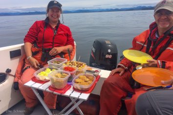 Angus packt auf dem Boot ein kleines Klapptischchen und die Tupperschüsseln aus und wir greifen alle ordentlich zu.