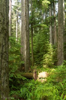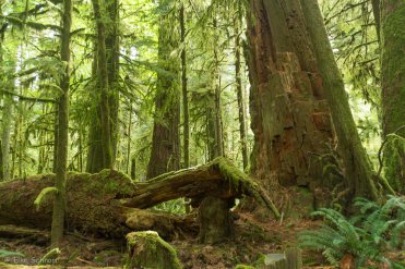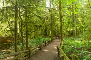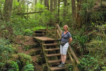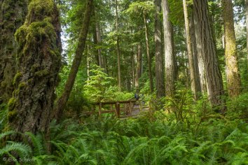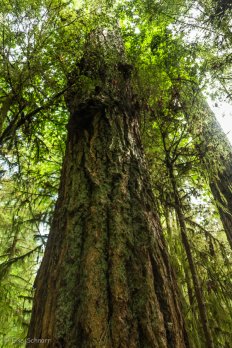 Auf beiden Seiten der Straße führt jeweils ein kurzer Trail durch den Märchenwald — der Big Tree Trail und der Old Growth Trail. Wir laufen nacheinander beide ab und sind vom Anblick der Giganten mächtig beeindruckt. Die größten Bäume ragen bis zu 75 Meter in die Höhe und haben einen Umfang von bis zu neun Metern.