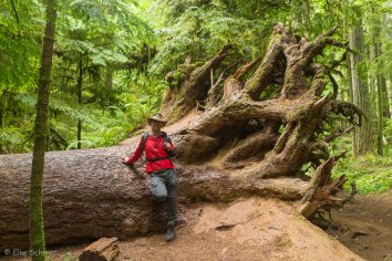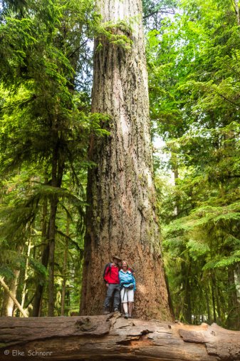 Highlight ist eine riesige 800 Jahre alte Douglasie, die am Rand des Rundweges in den Himmel ragt und an der kein Besucher vorbei gehen kann, ohne sich für ein Foto davor zu stellen — wir selbstverständlich auch nicht