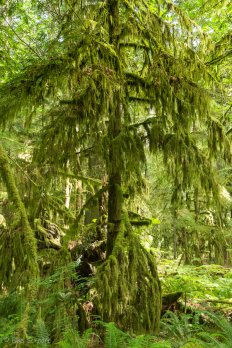 Es herrscht eine ganz besondere Stimmung: umgefallene Baumstämme liegen kreuz und quer herum, Farne wachsen hüfthoch und überall hängt grünes Moos an den Zweigen.