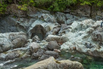 Als nächste folgt ein ganz spontaner Halt: Direkt am TC4 kommen wir an einer Haltebucht vorbei, in der einige Autos parken und viele Leute laufen abseits der Straße mit Kameras herum. Na, das schauen wir uns doch auch mal an. Grund für den Auflauf ist ein netter kleiner Creek — ich glaube, Wally Creek stand auf dem Schild — und wir knipsen ein paar Bilder.