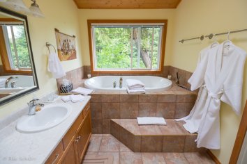 Das Haus liegt romantisch direkt am Meer und bei schönem Wetter hat man vom Balkon aus sicher eine tolle Aussicht. Unser Zimmer ist nett eingerichtet, das Bad hat einen tollen, verlockenden Jacuzzi und Platz ist auch mehr als genug vorhanden. Unsere Gastgeberin Gabrielle, eine nette ältere Dame, gibt uns noch einige Tipps für Restaurants in Tofino und erklärt uns die Gegebenheiten.