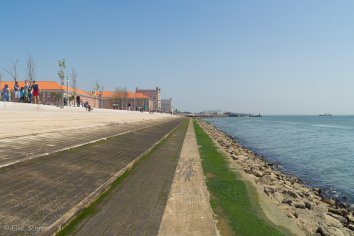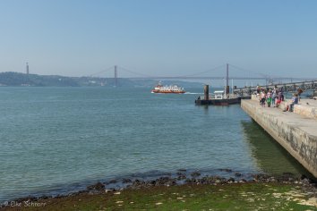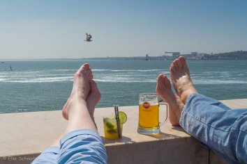 Weiter geht es zur Waterfront, wo es leider ein wenig trüb ist. Wir spazieren am Ufer des Tejos entlang und finden eine ideale Stelle, um unseren Füßen eine kurze Verschnaufpause zu gönnen — entspannt mit einem Bier und einer Caipirinha und dezenter Saxophonmusik im Hintergrund.