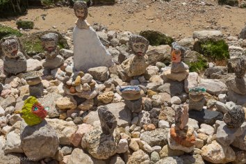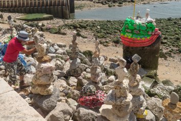Auch einen Steinkünstler entdecken wir, der mit viel Geschick und Fingerspitzengefühl diverse Steinmännchen am Strand aufbaut: