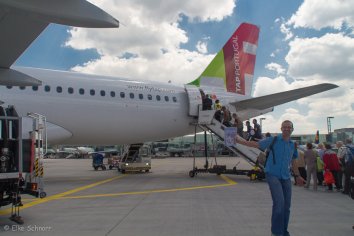 Ein weiterer Anruf bei der TAP ergibt, dass unsere ursprünglich gebuchte Verbindung heute Morgen gestrichen wurde und wir somit automatisch umgebucht wurden auf den nächstmöglichen Weiterflug. Na Klasse! Uns stehen also tatsächlich fünf Stunden Aufenthalt in Lissabon bevor