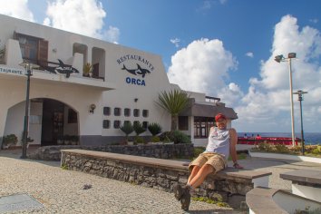 Wir spazieren an der Uferpromenade entlang, genießen die Sonne und das Meer und landen schließlich im Restaurant Orca, von dem aus man direkt auf das Meeresschwimmbad schauen kann.