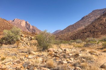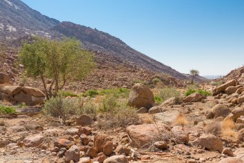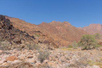 Als wir irgendwann wieder unten im Flussbett des Ugab ankommen, wird das Fahren deutlich angenehmer und wir können uns nebenbei ein bisschen nach den Wüstenelefanten umschauen, die hier leben sollen — allerdings leider erfolglos.