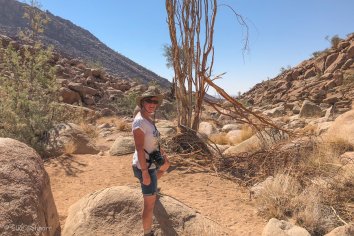 Wir brauchen natürlich deutlich länger als ursprünglich geplant und kommen erst nach 12:00 Uhr am Brandberg an. Aber da wir heute ein eher entspanntes Programm haben, ist das nicht weiter schlimm. Wir essen unsere Brote, schnüren die Wanderschuhe und melden uns an der Rezeption an für die Wanderung zur White Lady.