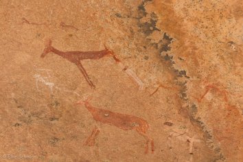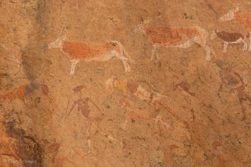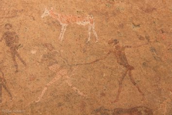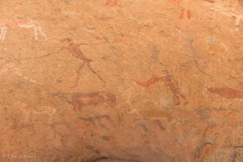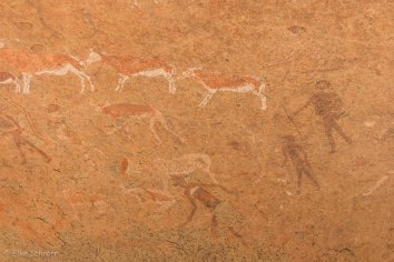 Die Zeichnungen sind etwa zwei- bis viertausend Jahre alt und zeigen zahlreiche Jäger mit Speeren oder Bögen, umgeben vom typischen Jagdwild wie Oryxantilopen und Zebras.