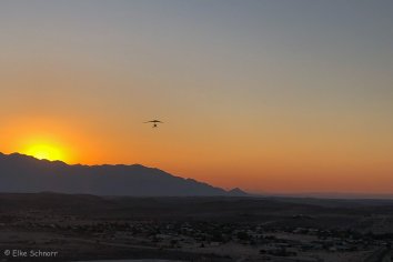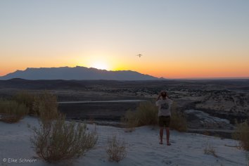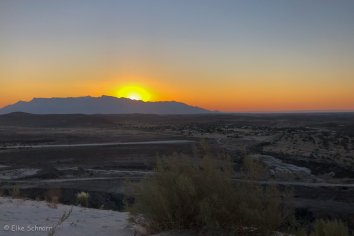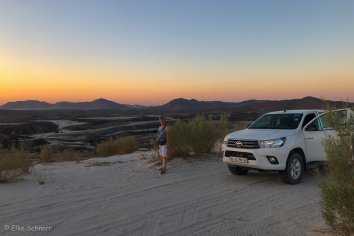 Kurz vor Sonnenuntergang fahren wir noch auf die stillgelegte Abraumhalde der ehemaligen Zinnmine hinauf, von wo man einen tollen Ausblick hat. Normalerweise macht Naphtali diese Sundowner-Tour mit seinen Gästen, aber im Moment ist sein Landrover kaputt, so dass wir nach seiner Wegbeschreibung selbst fahren.