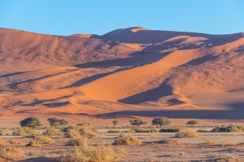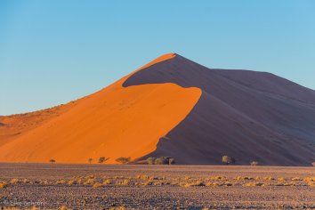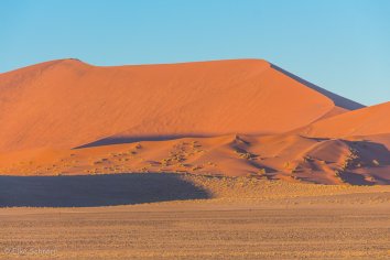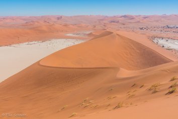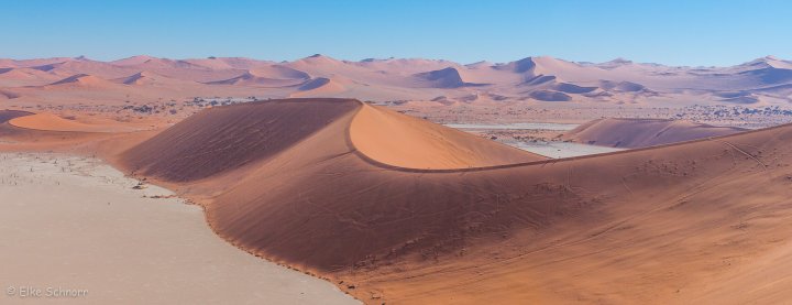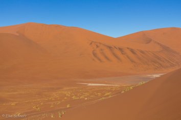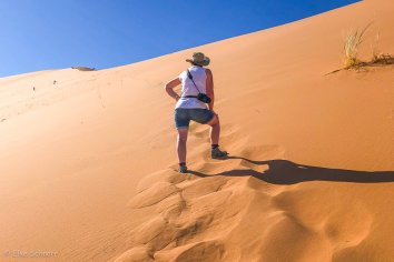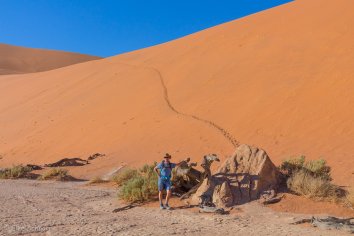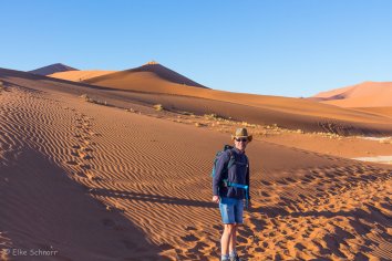 Die Menge teilt sich dann auf — eine Hälfte beginnt schnurstracks mit der Erklimmung von Big Daddy, die andere bewegt sich in Richtung Dead Vlei. Wir schließen uns der zweiten an, da wir das letzte Morgenlicht gerne noch für die toten Bäume haben möchten.