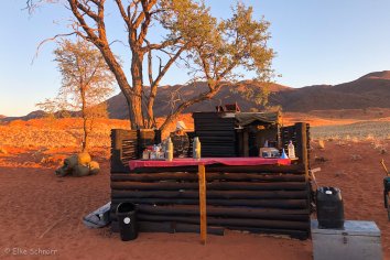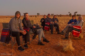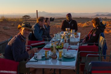 Und wie bereits gestern präsentiert Puye das Menü zunächst auf englisch und Stanley übersetzt es dann in die Klicksprache der Damara (was für unsere beiden Franzosen aber auch nicht hilfreich ist