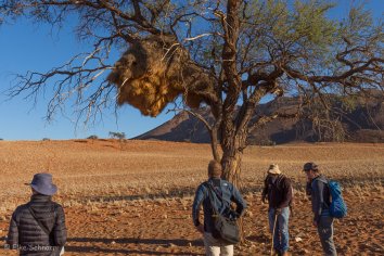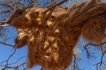 Später entdecken wir ein ziemlich großes Webervogelnest. Sebastian schätzt, dass es etwa 35 Jahre alt ist und in ihm so um die 60 Vögel leben. In der Kalahari soll es noch viel größere Nester geben, in denen dann teilweise 200-300 Vögel wohnen — vielleicht bekommen wir ja auf unserer Reise noch eines zu sehen.