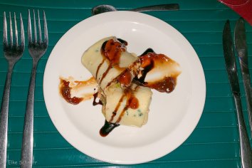 Heute gibt es als Vorspeise mit Hühnchen gefüllte Pfannkuchen, als Hauptgang Lammspieß mit Bohnen und Käsemakkaroni und als Nachtisch einen sehr leckeren Schokoladenpudding.