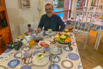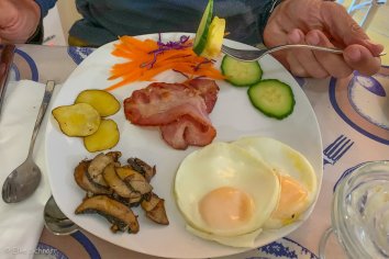 Die Frühstückstische sind nett gedeckt — endlich mal wieder kein Buffet. Eine reichliche Obstauswahl, Joghurt und Eierspeisen nach Wunsch sind für uns vollkommen ausreichend und perfekt.