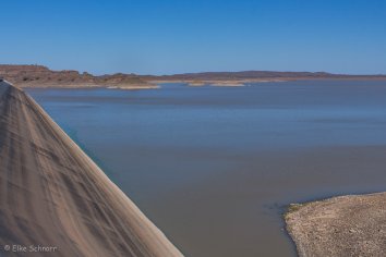 Gegen 11:30 Uhr erreichen wir den Damm. Da es sich hier um einen Nationalpark handelt, müssen wir 90 NAD Eintritt zahlen und erhalten damit Zugang zu den Damm-Anlagen und zum Naturschutzgebiet an der Südseite des Stausees.