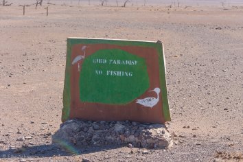 Das Wasser im Stausee ist soweit zurückgegangen, dass man von der Fahrstraße im Game Park aus das Ufer überhaupt nicht mehr sehen kann und auf unserer kurzen Rundfahrt sehen wir nicht ein einziges Tier. Lediglich ein paar Schilder, die darauf hindeuten, dass es hier irgendwann einmal Tiere gegeben hat und ein völlig deplatziertes „No fishing“-Schild.