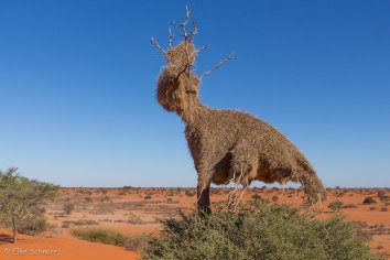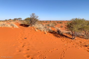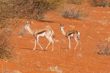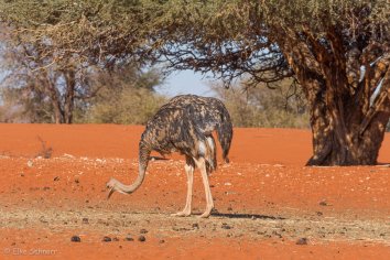 Dabei sehen wir im Gelände jede Menge Tiere: Elands, Springböcke, korpulierende Esel und Strauße, die sich in dem roten Kalahari-Sand außerordentlich fotogen präsentieren.