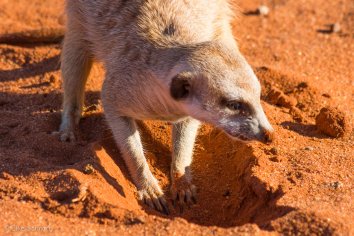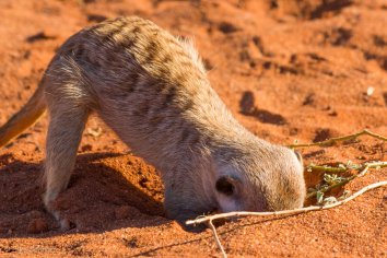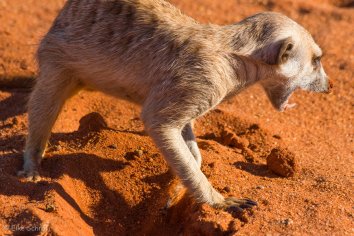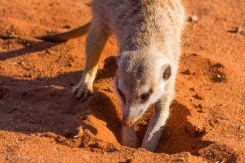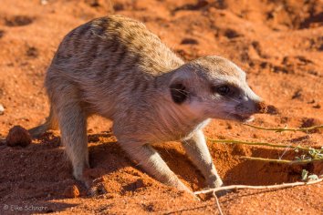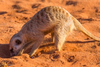 Außerdem beobachten wir eine ganze Weile lang drollige Erdmännchen, wie diese auf der Jagd nach Skorpionen tiefe Löcher in den Sand buddeln — eines von ihnen sogar äußerst erfolgreich.