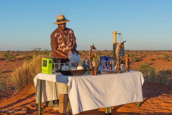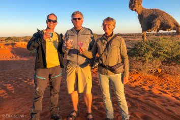 Werner sorgt dafür, dass wir erstmalig in diesem Urlaub einen Gin-Tonic probieren — quasi der Standard-Sundowner, der hier in Namibia getrunken wird. Normalerweise ist das überhaupt nicht unser Geschmack, aber hier und heute finden wir ihn richtig gut. Das liegt womöglich an der netten Gesellschaft